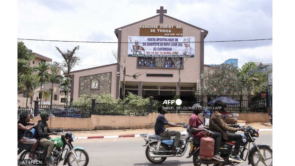 Varias motocicletas pasan junto a una iglesia en una calle donde un cartel anuncia la visita apostólica del Papa León XIV a Camerún, en Yaundé, el 8 de abril de 2026. (Foto de Daniel BELOUMOU OLOMO / AFP)