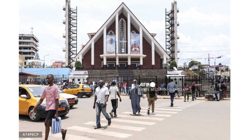 Peatones caminan por una calle cercana a la catedral de Notre Dame des Victoires, donde se exhiben retratos del papa León XIV, en Yaundé, el 8 de abril de 2026. (Foto de Daniel BELOUMOU OLOMO / AFP)