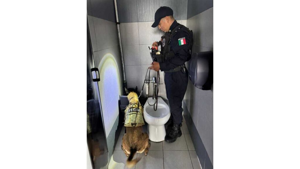 En Tulum, autoridades localizaron droga en uno de los baños de la terminal de autobuses ADO durante un operativo preventivo realizado por el Grupo Canino K-9 de la Secretaría de Seguridad Ciudadana.