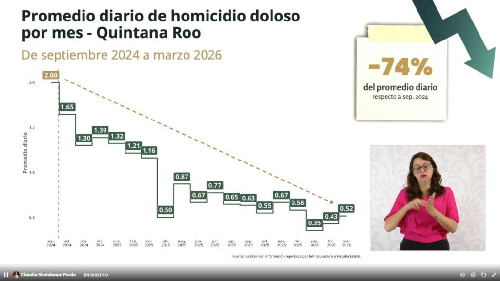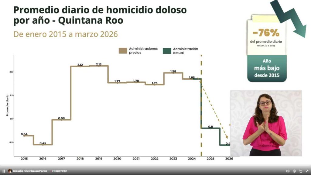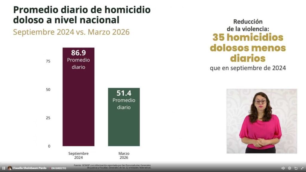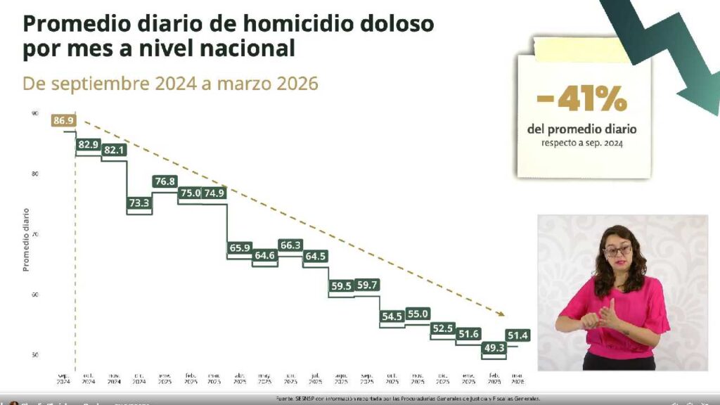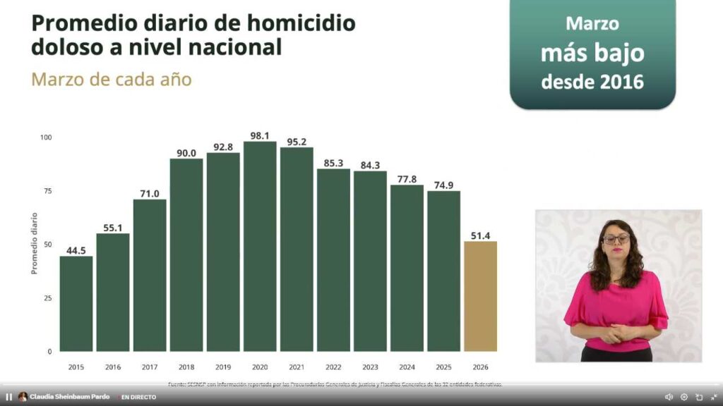 De acuerdo con datos oficiales, el promedio diario de homicidios dolosos ha disminuido de forma sostenida desde 2015 hasta marzo de 2026, alcanzando una reducción del 76%.