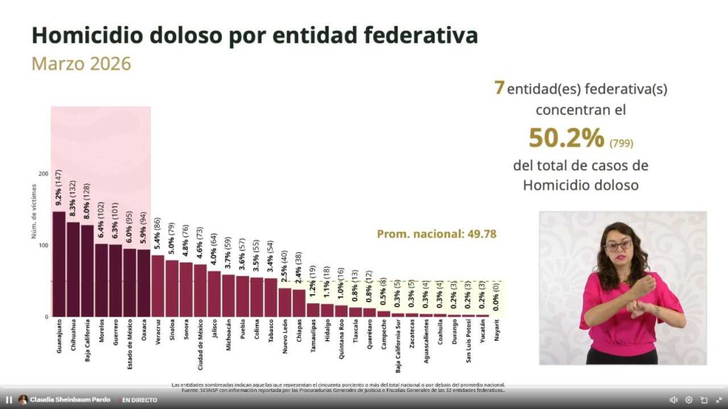 A nivel nacional, el primer trimestre de 2026 se posiciona como el más bajo en más de una década, con un promedio de 50.8 homicidios diarios, lo que refuerza la tendencia a la baja en materia de seguridad pública.