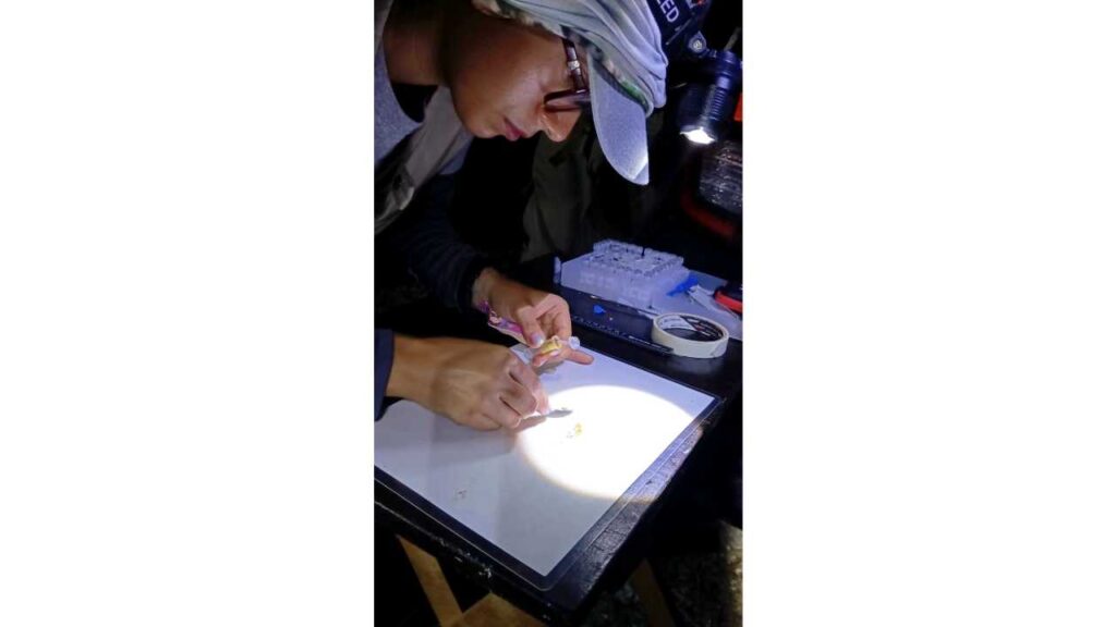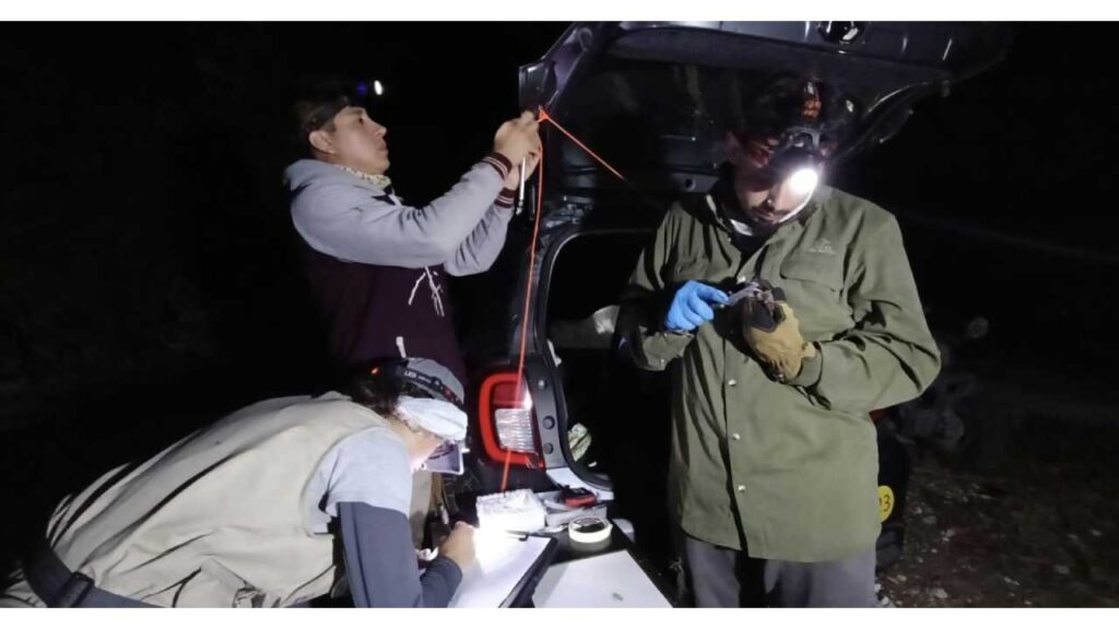 Durante la campaña se instalaron redes de niebla para captura temporal y posterior liberación de ejemplares bajo protocolos científicos. También se recolectaron muestras para análisis molecular.