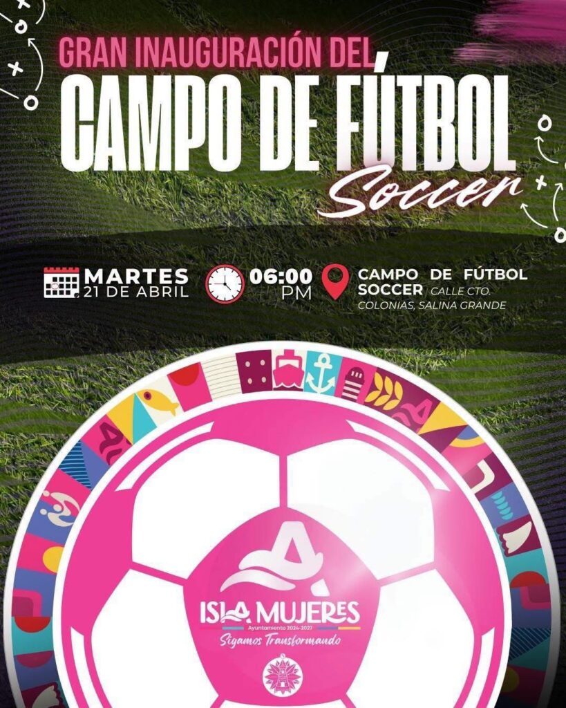 La presidenta municipal, Atenea Gómez Ricalde, anunció que este martes 21 de abril se llevará a cabo la inauguración de la nueva cancha de fútbol soccer en la colonia Salinas de Isla Mujeres. Esta obra busca fortalecer el tejido social y ofrecer espacios de calidad para la activación física de las familias isleñas.