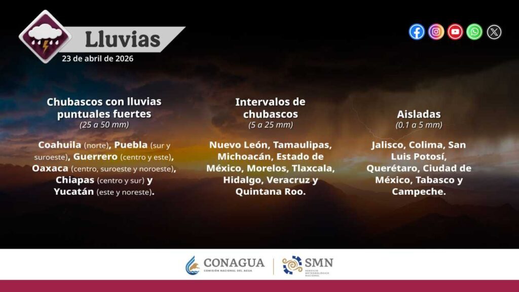 • Othón P. Blanco: Cielo parcialmente nublado, baja probabilidad de lluvias, 32 a 34°C, ambiente caluroso.