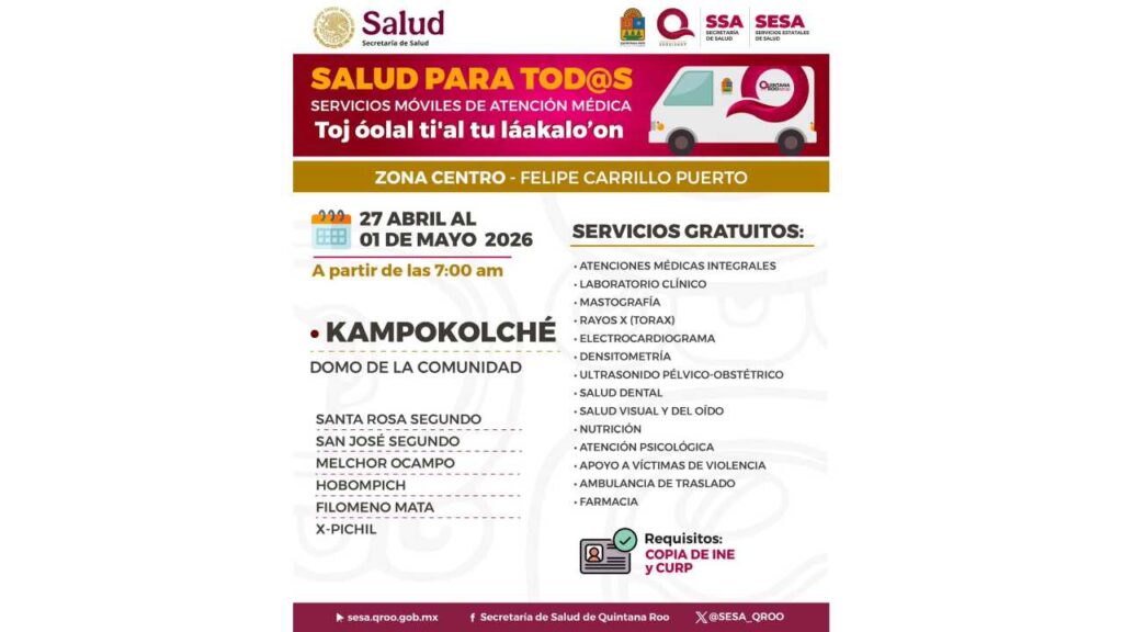 Las caravanas médicas iniciaron operaciones este lunes 27 de abril en Bacalar, Puerto Morelos y Felipe Carrillo Puerto, con servicios gratuitos para toda la población.