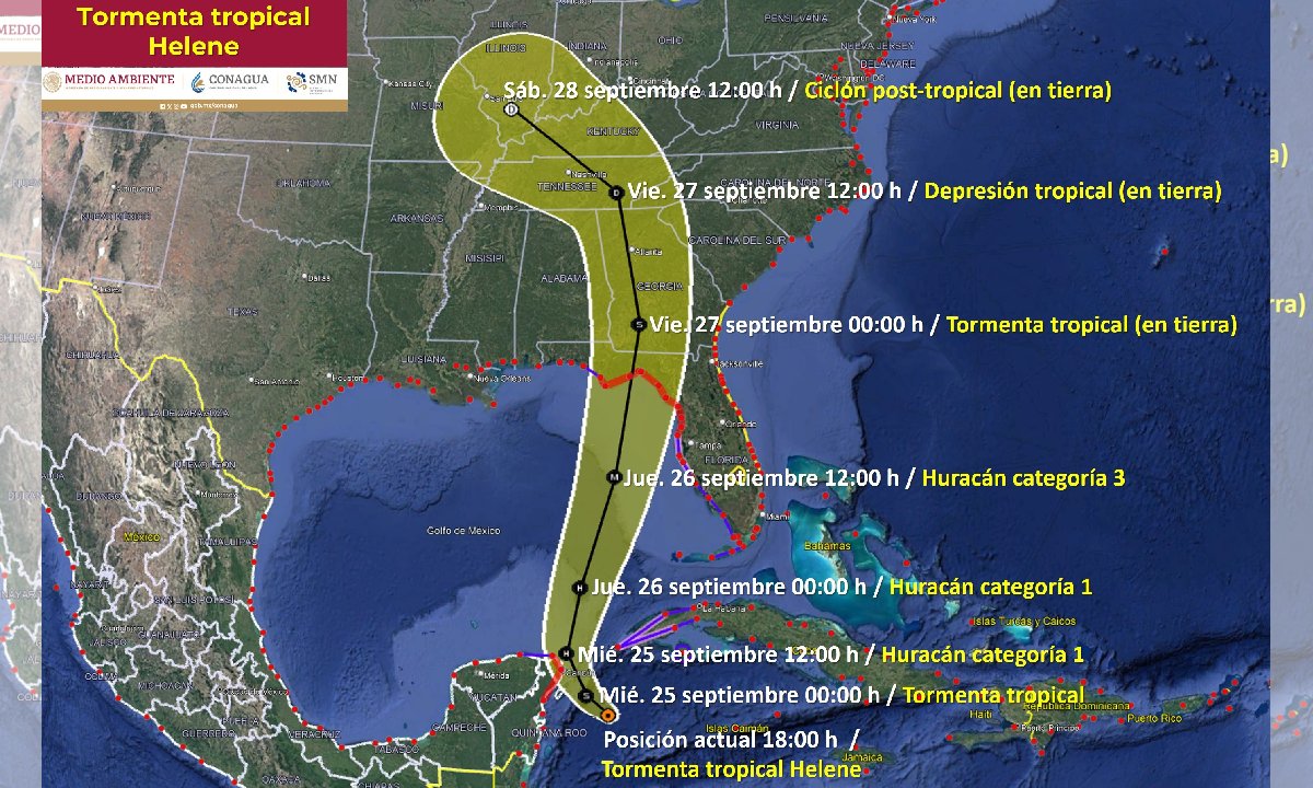 Para mañana, Helene se desplazará sobre el Canal de Yucatán y podría convertirse en un huracán categoría 1, acercándose peligrosamente a la costa de Cancún, Quintana Roo. Este fenómeno generará condiciones meteorológicas aún más severas, con lluvias torrenciales y vientos más intensos, afectando gran parte de la región.