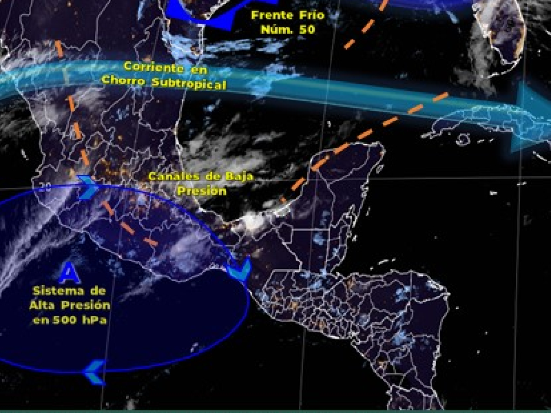 Este sábado, el frente frío Núm. 50 se extenderá desde el noreste del Golfo de México hasta el norte del país, interaccionará con un canal de baja presión sobre el oriente del territorio nacional, generando chubascos y lluvias fuertes en dichas regiones, con lluvias puntuales muy fuertes en Nuevo León, Tamaulipas y San Luis Potosí, así como vientos muy fuertes con rachas de 70 a 80 km/h y posible formación de torbellinos o tornados en el norte de Coahuila, Nuevo León y Tamaulipas. Otros canales de baja presión en el centro y sureste del país, aunados al ingreso de humedad de ambos océanos, producirán chubascos y lluvias fuertes en ambas regiones, con lluvias puntuales muy fuertes en Puebla, Veracruz y Oaxaca. Finalmente, un sistema anticiclónico en niveles medios de la atmósfera ocasionará ambiente caluroso a muy caluroso en el litoral del Pacífico Mexicano, con temperaturas máximas superiores a 40 °C en zonas de Jalisco, Colima, Michoacán y Guerrero.