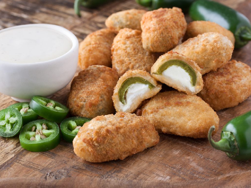 Los jalapeño poppers son un clásico de la comida rápida estadounidense, suele prepararse habitualmente para el Super Bowl, generalmente acompañados de una salsa roja, con tomates y cebolla tatemados.