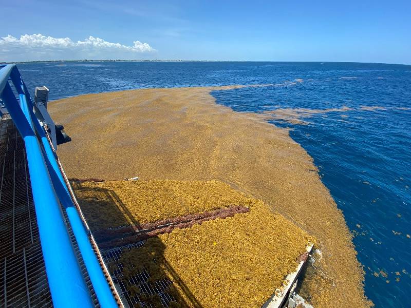 En cuanto a los trabajos en coordinación con la SEMAR, puntualizó que se encuentra frente a las costas de Puerto Morelos el buque oceánico Natans, que es una embarcación sargacera costera, y dos buques menores para atajar el sargazo en aguas someras y profundas, con 18 elementos de la institución. mismos que en la semana del 7 al 11 de agosto recolectaron más de 100 toneladas, mismas que son llevadas al muelle fiscal para trasladarlas a la zona de confinamiento.