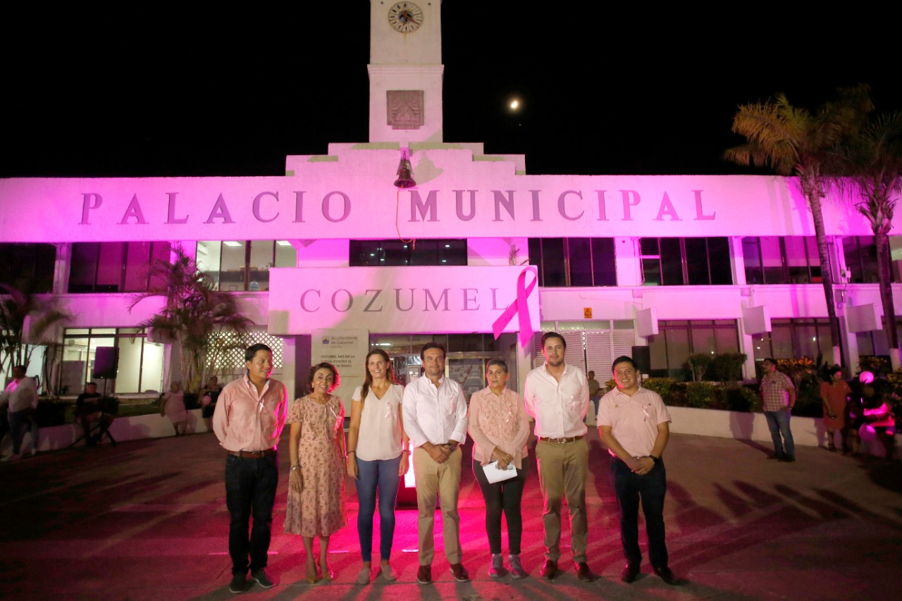 Inician conmemoraciones en Cozumel por el mes del cáncer de mama; iluminan Palacio Municipal con luz rosa