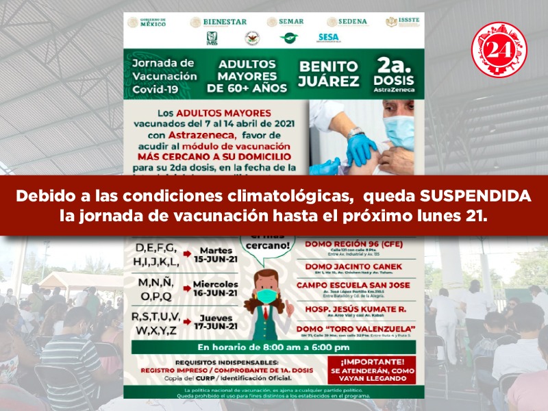 La secretaría de Bienestar informó que la vacunación contra Covid-19 de adultos mayores y adultos en Quintana Roo, queda suspendida por condiciones climáticas