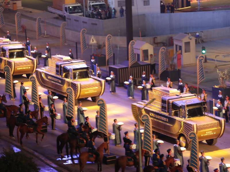 Con un estricto operativo de seguridad, se construyó un desfile con fuertes dosis de espectáculo multimedia: las momias fueron transportadas en vehículos arreglados para semejar los carros funerarios en los que originalmente fueron conducidos a sus sepulcros, muchos de ellos ubicados en el legendario Valle de los Reyes, donde a lo largo del siglo XX se hicieron numerosos rescates arqueológicos.
