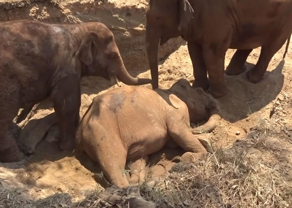 El elefante bebé llora y su familia monta guardia junto a la abuela muerta