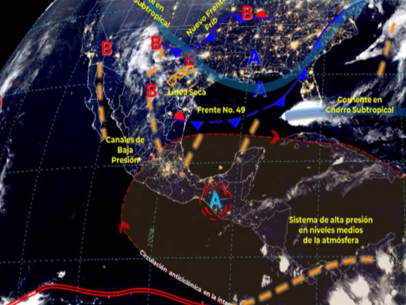 masa de aire frío por su parte no afectará la zona de la Península de Yucatán, donde el sistema de alta presión generará un ambiente caluroso a muy caluroso
