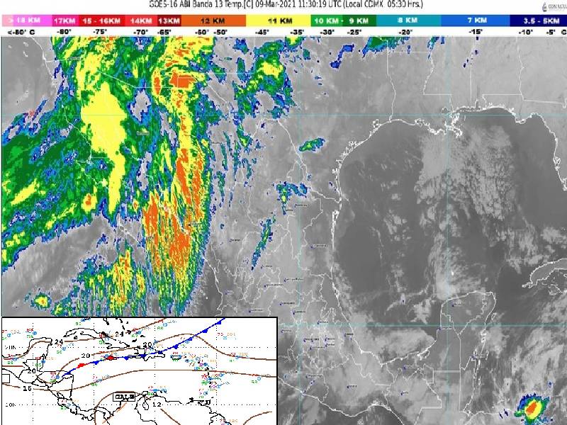 Se mantiene la entrada de aire marítimo tropical procedente del mar Caribe con variado contenido de humedad hacia la península de Yucatán