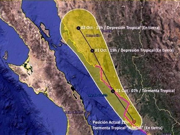 La tormenta tropical 'Narda' tocó tierra aproximadamente a 35 kilómetros al sur de Los Mochis, Municipio de Ahome, y a 16 kilómetros al nor-noreste de Topolobampo, ambos en Sinaloa.