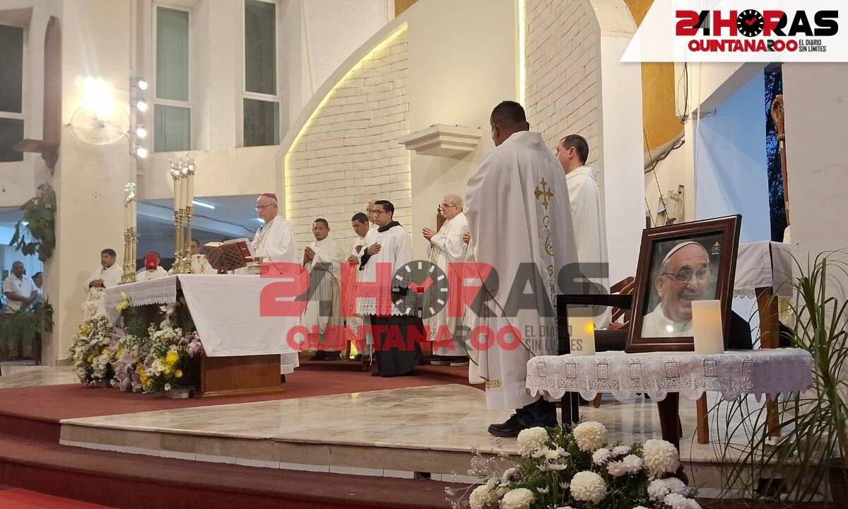 Cientos de fieles católicos acudieron al llamado de la Diócesis de Cancún-Chetumal para participar en una misa en memoria del Papa Francisco.