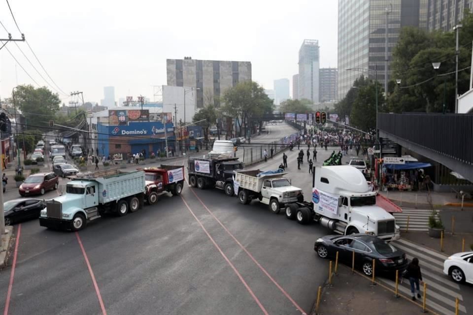 Integrantes del Sindicato Petroleros de México (Petromex) bloquean ambos sentidos de Marina Nacional, a la altura de la Torre de Pemex.