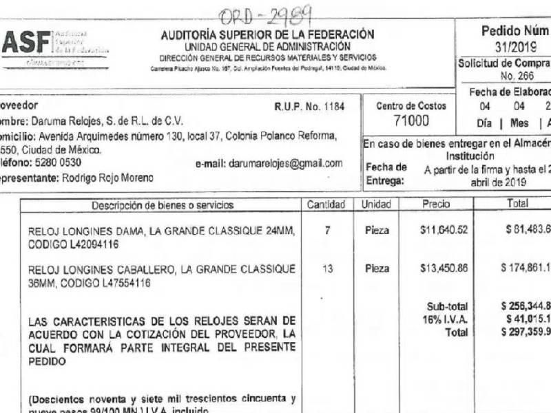 Los relojes de lujo son modelo "La Grande Classique" y la ASF adquirió siete para mujer y 13 para hombres a la empresa Daruma Relojes, S de RL de CV