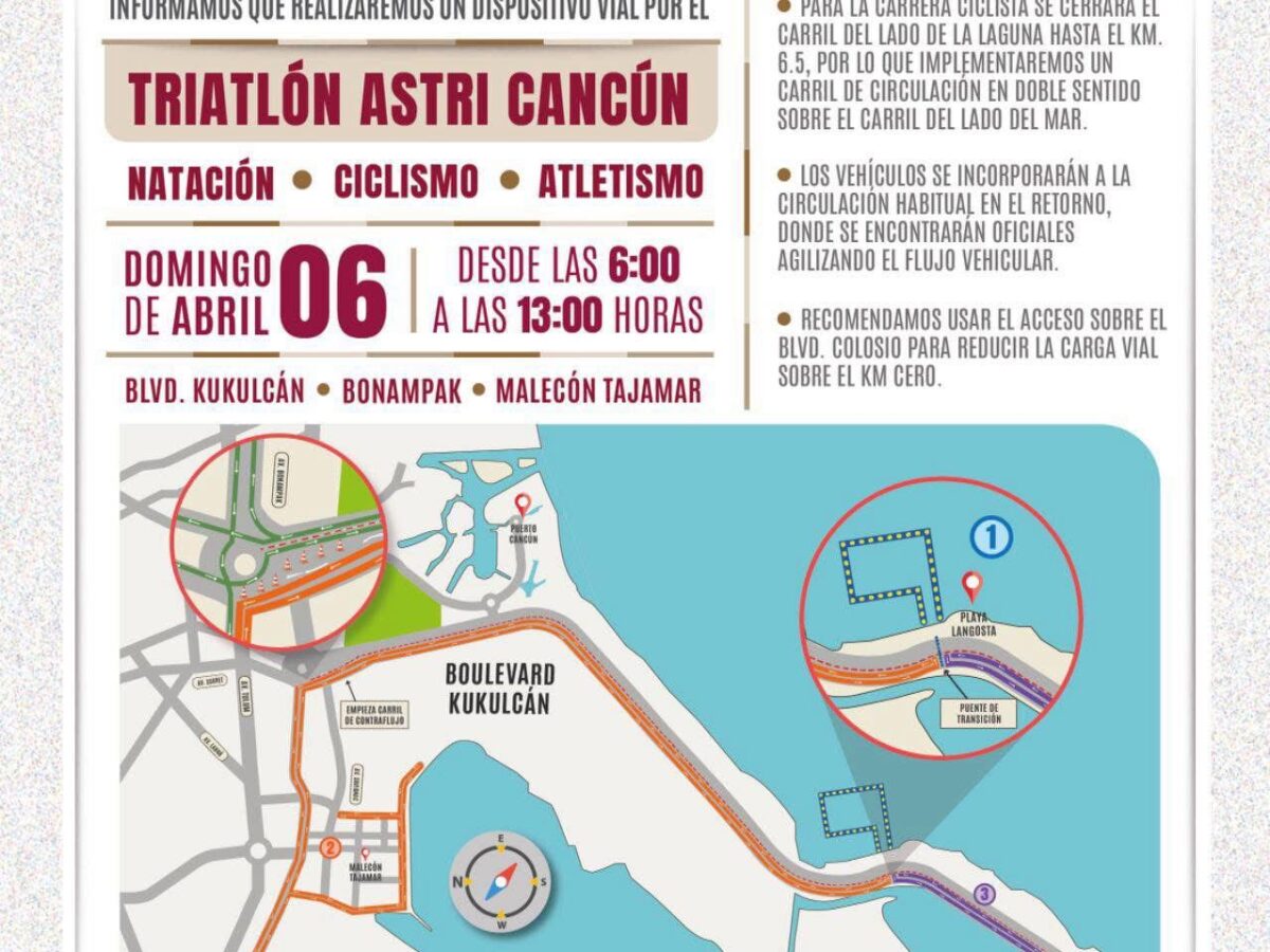 Dispositivo vial por Triatlón Astri Cancún, este domingo 6 de abril