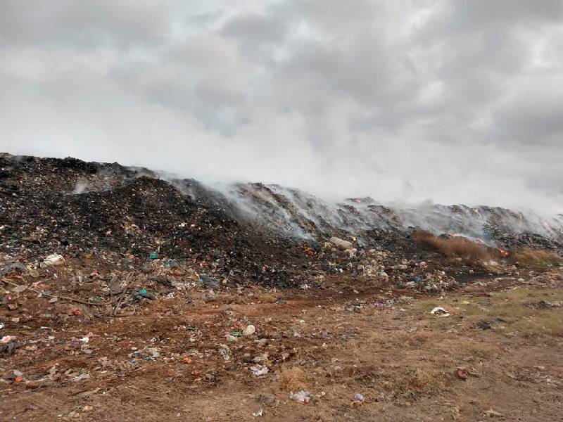 Elementos del Cuerpo de Bomberos con apoyo de la Dirección de Protección Civil municipal mantienen trabajos de sofocación del relleno sanitario de esta ciudad