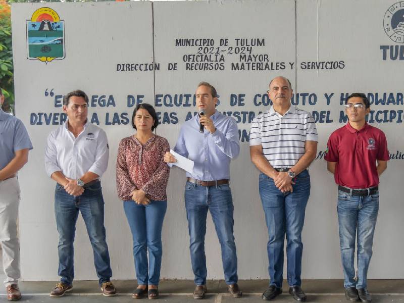 El Presidente Municipal de Tulum, Diego Castañón Trejo encabezó la entrega de equipos de cómputo y hardware diverso a las áreas administrativas del Ayuntamiento