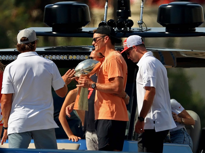 El miércoles, Tom Brady lanzó desde su yate el trofeo a manos de Rob Gronkowski durante el desfile de botes que realizaron los Bucaneros