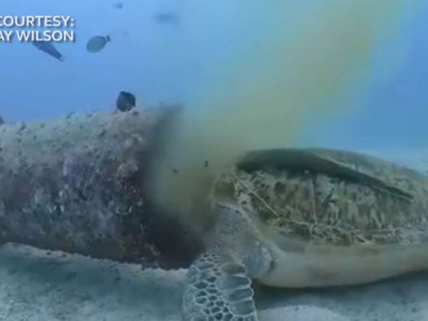 Una tortuga marina comiendo los residuos que salen de una tubería en el océano, incluso, el animal que pertenece a una especie en peligro de extinción, tiene que meter la cabeza para poder comer algo.