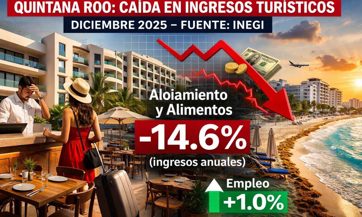 Quintana Roo reporta caída anual de 14.6% en ingresos por hospedaje y alimentos en diciembre de 2025, según la EMS del Inegi.